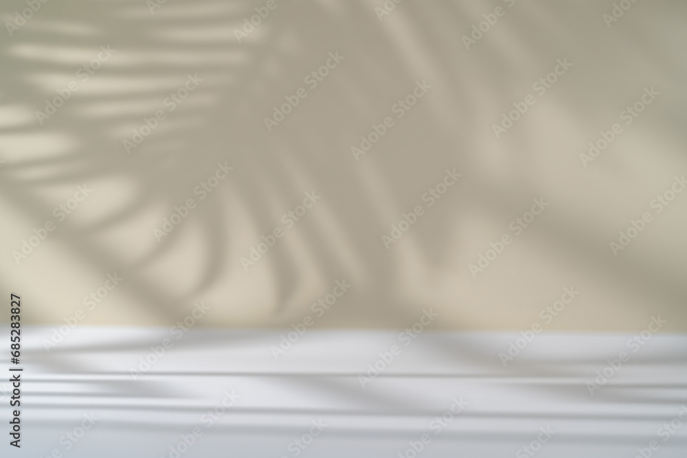 Shadow of tropical palm leaves and geometric shapes on white wall. Minimal abstract light white background for product presentation.