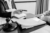 Lawyer working legal data contract at workplace..