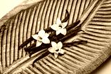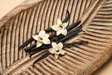 Wooden board with aromatic vanilla sticks and flowers on beige background