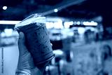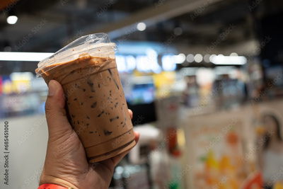 Close up view of iced Mocha coffee against blur image of department store background.
