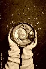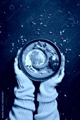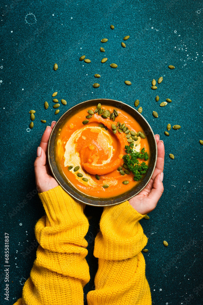 Female hands holding a bowl of pumpkin cream soup on a dark background. Autumn food concept. Top view.