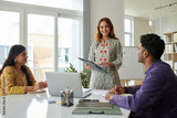 Smiling confident female entrepreneur taking in front of colleagues in board room