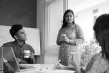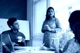 Indian business colleagues in traditional clothes having coffee and discussing news and gossips