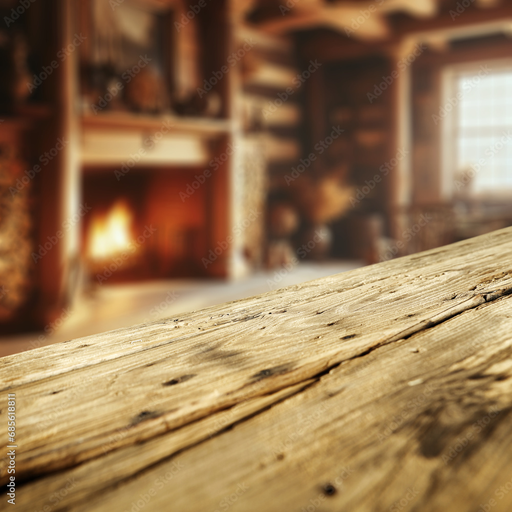 Wooden desk of free space and home interior with fireplace. Christmas time.