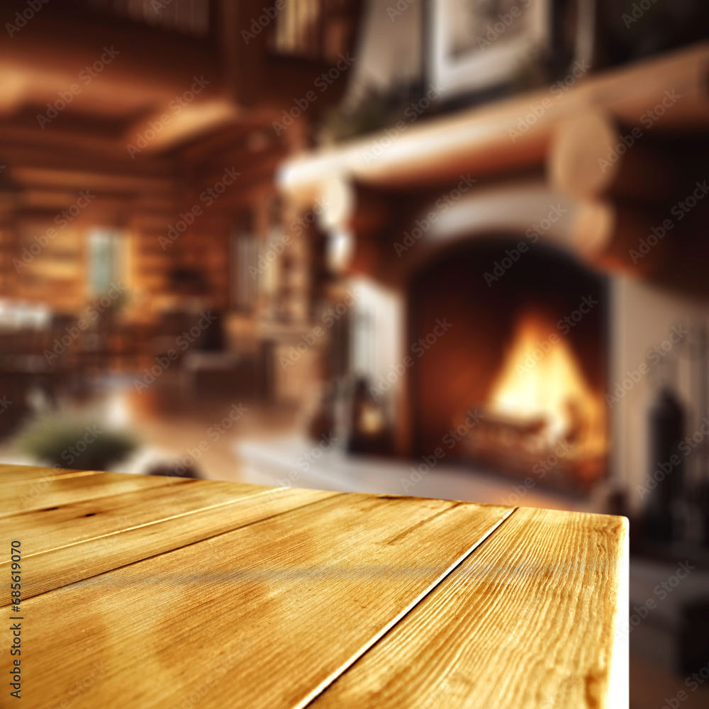 Wooden desk of free space and home interior with fireplace. Christmas time.
