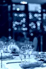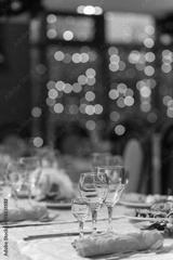 Served festive table with snacks, glasses, glasses, cutlery and napkins for a banquet