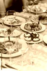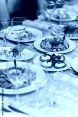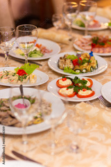 Served festive table with snacks, glasses, glasses, cutlery and napkins for a banquet