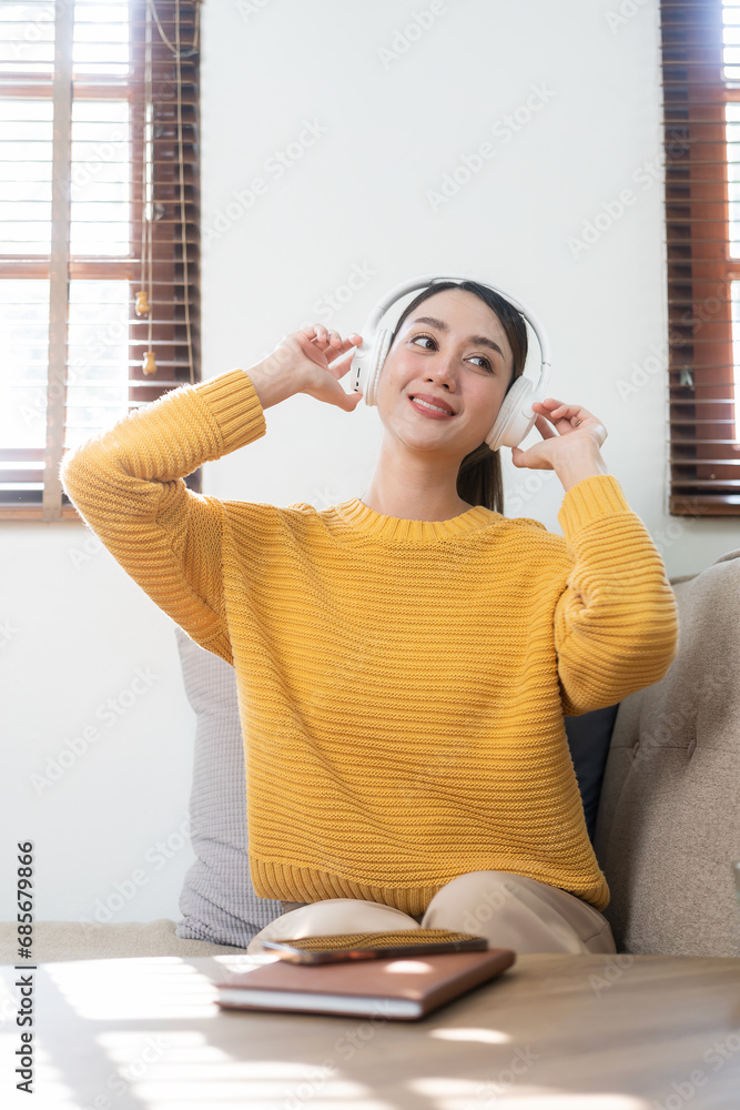 Smiling Asian girl wearing headphones using laptop Looking at the screen is happy listening to music while working online. Excited about student language learning, work at home concept