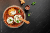 bread with cream cheese on a dark background. banner, menu, recipe copy space, top view