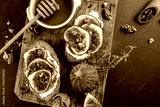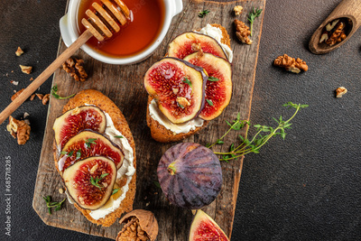 Bruschettas with figs and cheese on a dark background. top view. copy space for text
