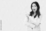 Beautiful young business woman pointing up to copy space and looking at camera with smile face and happy Pretty girl act like a satisfied product, use for advertising with isolated on pink background