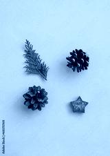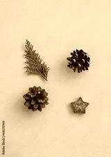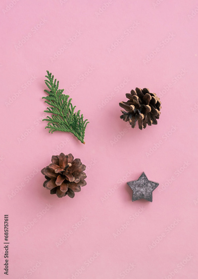 Christmas celebration concept composition with pine cone and thuja branches on the pink background.