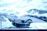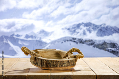 Desk of free space and winter landscape of mountains. Board with pedestal. Mockup background and winter december time.
