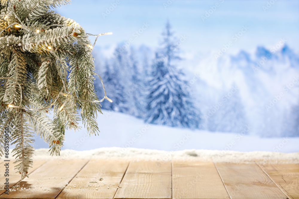 Desk of free space and winter landscape of mountains. Board with pedestal. Mockup background and winter december time.
