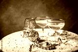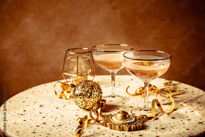 Happy New Year celebration, two glasses of champagne, streamers and ornaments