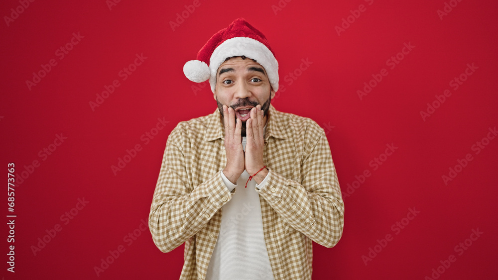 Young hispanic man surprise expression wearing christmas hat over isolated red background