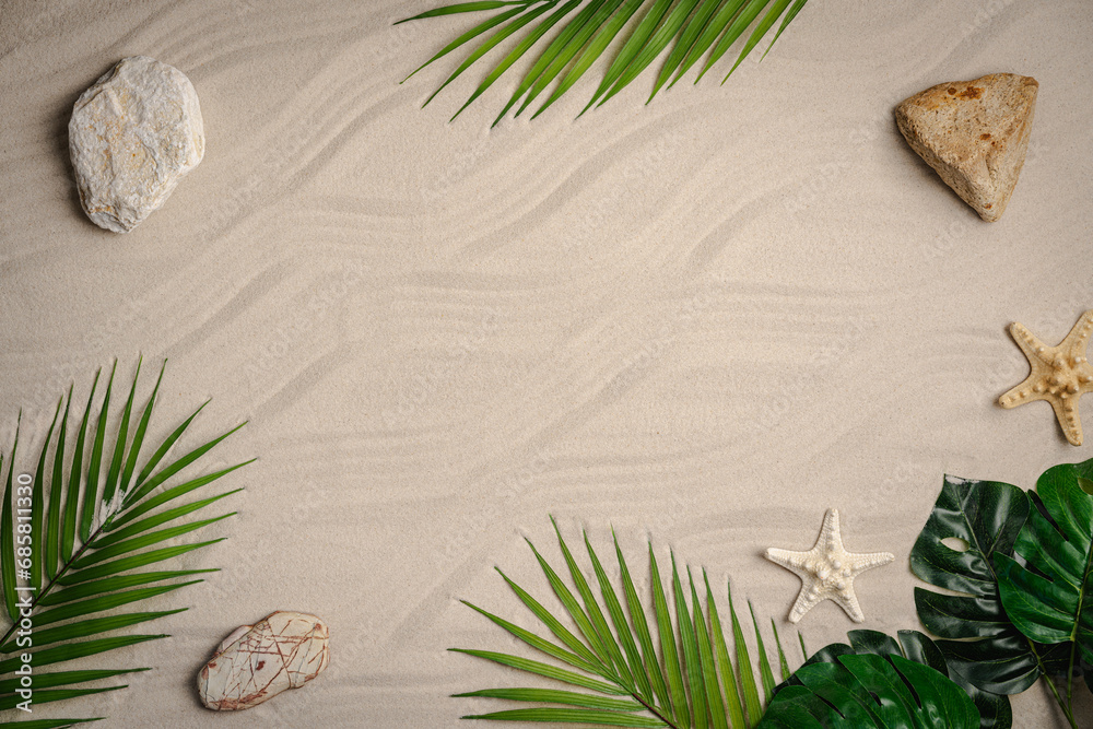 Sand texture. Sandy beach with tropical leaves and stones for background. Top view. Natural sand stone texture background. Wavy sand background for summer designs.