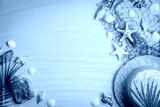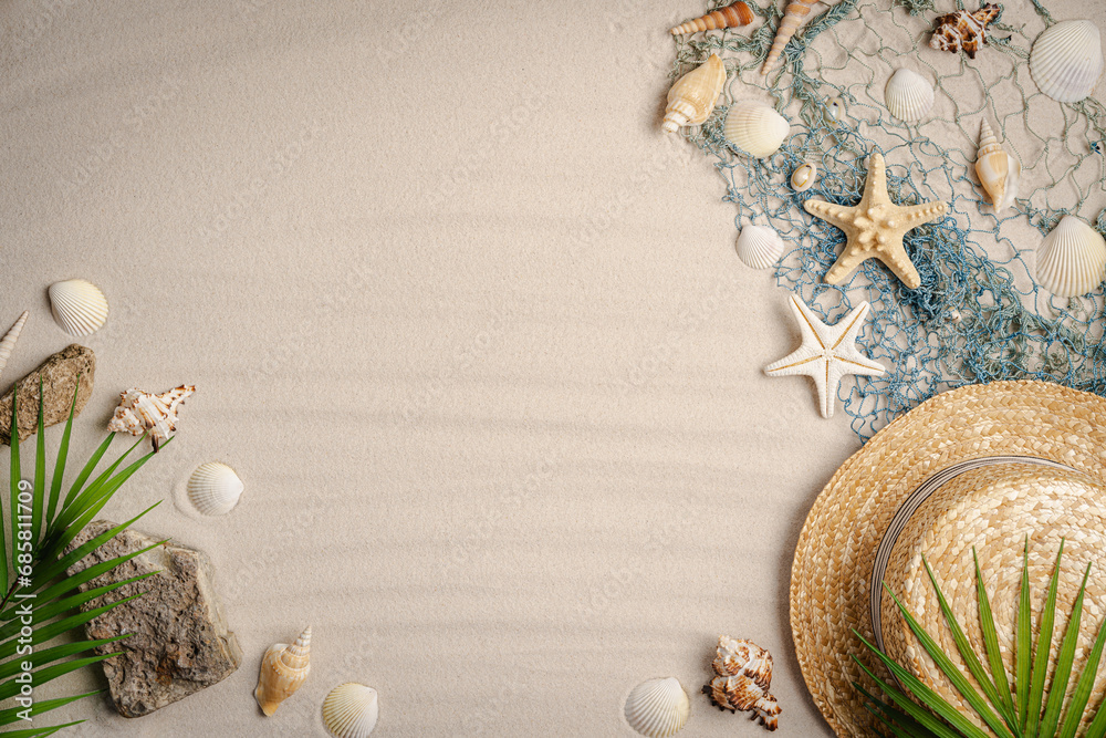White sea sand with starfish and seashells. Top view with copy space. Summer beach. Sea summer vacation background