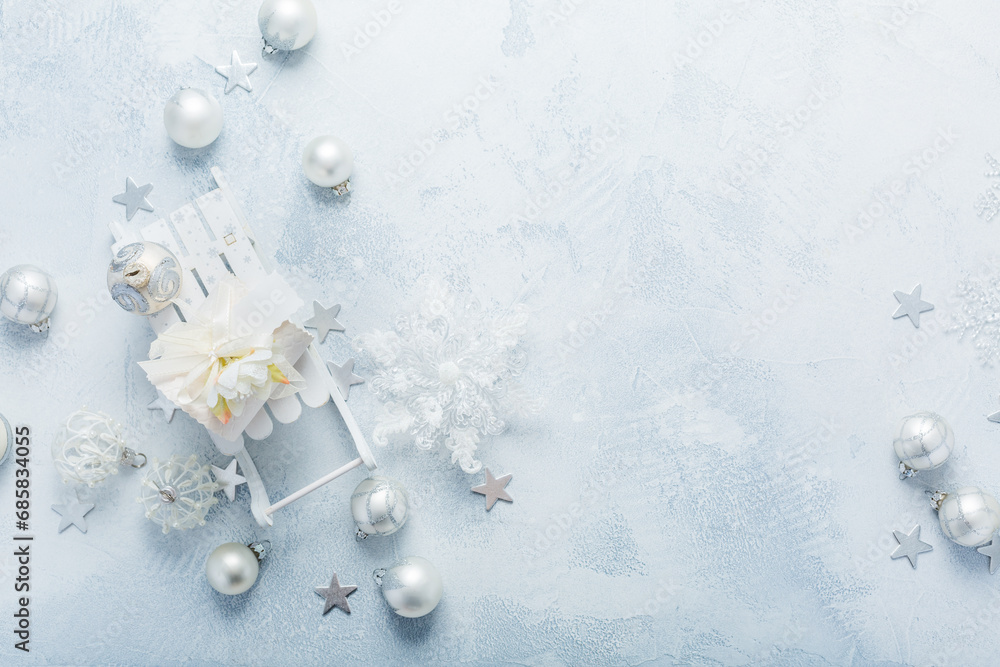 Christmas ornaments and ball in white and blue tone. Holiday Christmas background with copy space