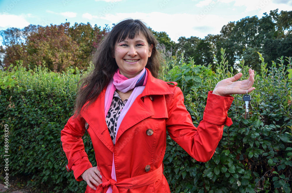 Cute smiling brunette girl showing bunch of house keys in a hand towards the camera. Real estate agent idea