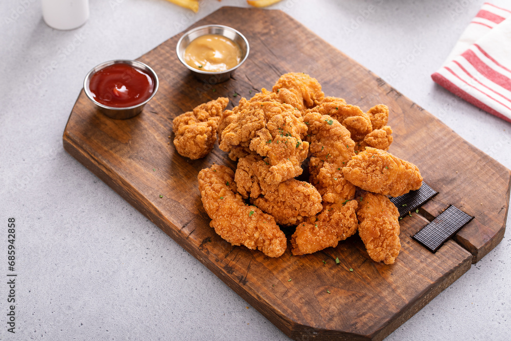 Chicken nuggets or chicken strips on a board with dipping sauces, fries and celery