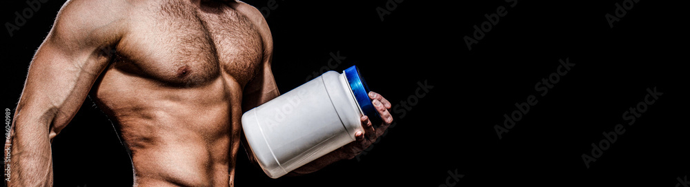 Sportsman hold dieting pill. Doping, anabolic, protein, steroid, sport vitamin bodybuilder and bodybuilding