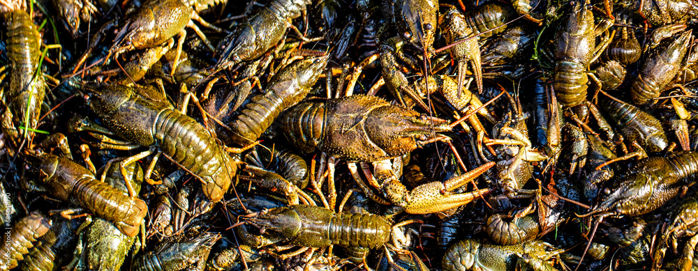 Crayfishs live, river food. Living crayfish in water. Caught crayfishs. Cancers on the background of crayfish. Large lobster. One large river crayfish