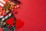 Top view composition of clapperboard, 3D glasses, popcorn, spilled from box, candies, and heart-shaped decor on a romantic red backdrop. Ideal for capturing the essence of love and cinematic charm
