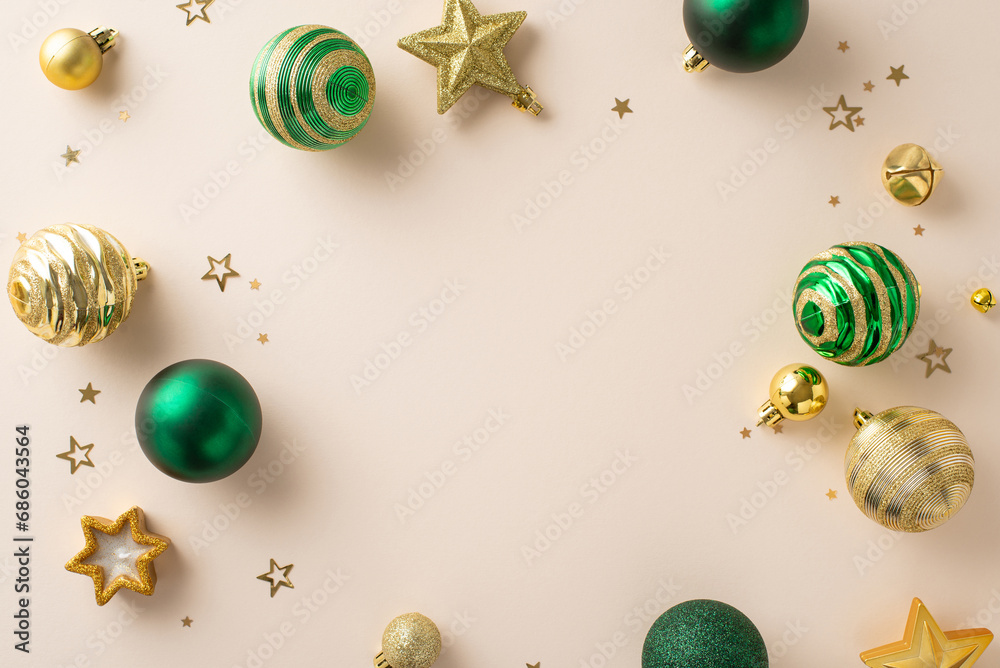 Holiday grandeur inspiration. Top-view image of luxurious ornaments, glistening star accent, candle, jingling bells, golden confetti on pastel beige background, frame perfect for promotional text