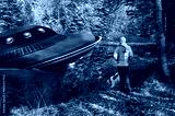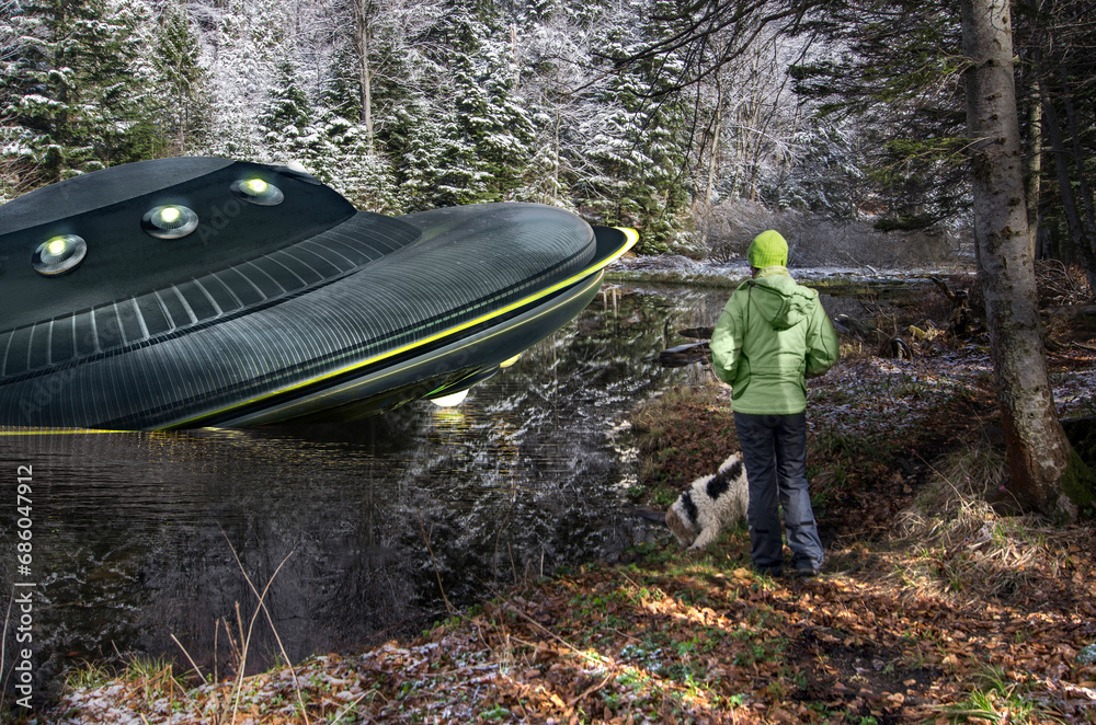 Person or child looking at UFO, broken space saucer lies in the water on the banks of a river or lake after an accident and crash. Landscape with invasion by extraterrestrial space object