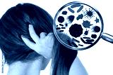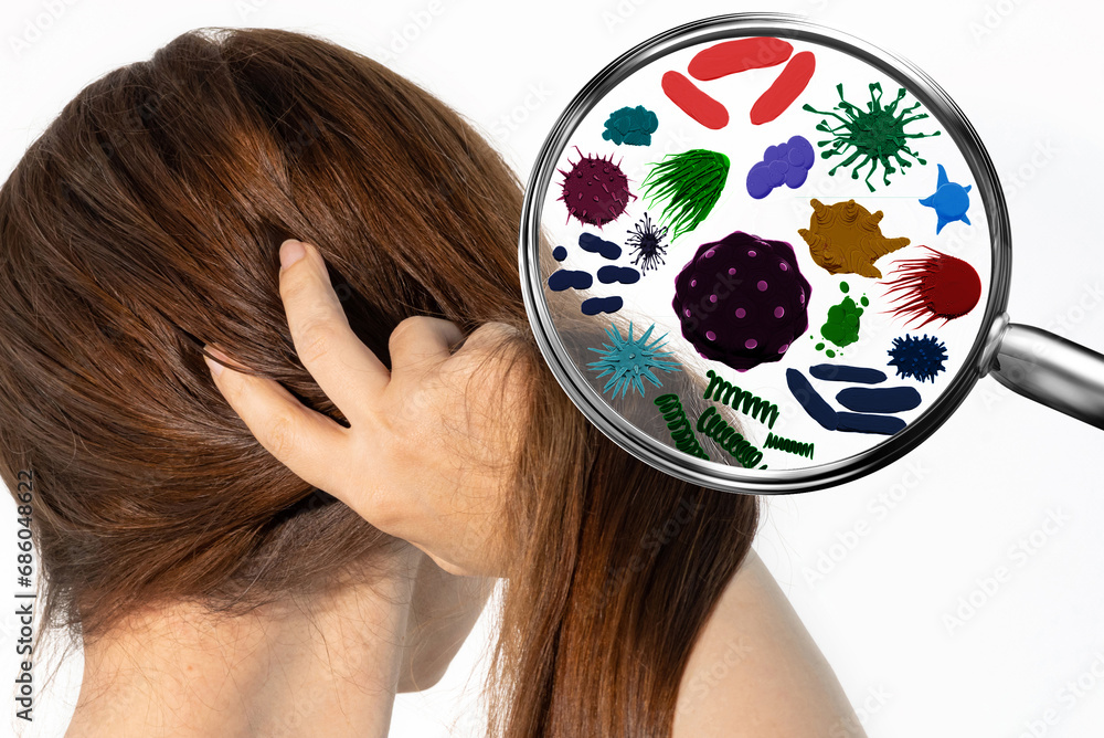 Magnifying lens with simulated germs, dandruff, viruses, bacteria, allergen. Long brown female hair