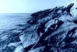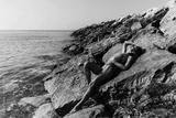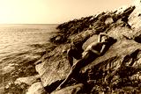 A beautiful young, sensual woman in a swimsuit is lying on the rocks by the sea.