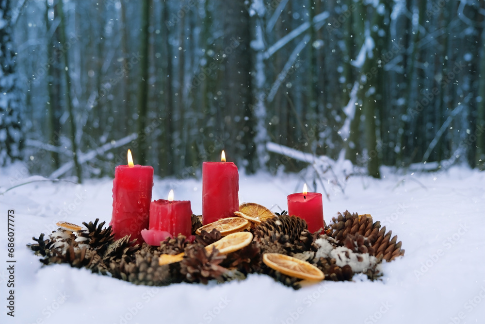 winter nature background with burning candles. candles, cones, dry orange slices in snow. magic winter scene in forest. Christmas, New Year Holidays. witchcraft ritual for Yule, Winter Solstice