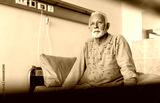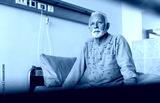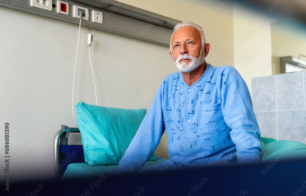 Thoughtful senior male patient in hospital bed in ward room. Healthcare people problem concept