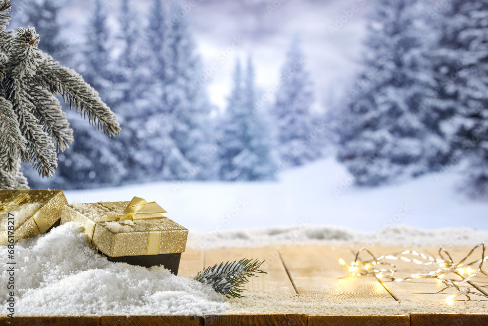 Board cover of frost and snow flakes. Christmas composition on top with empty space for your decoratio Cold december day. Empty space for your products.