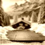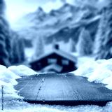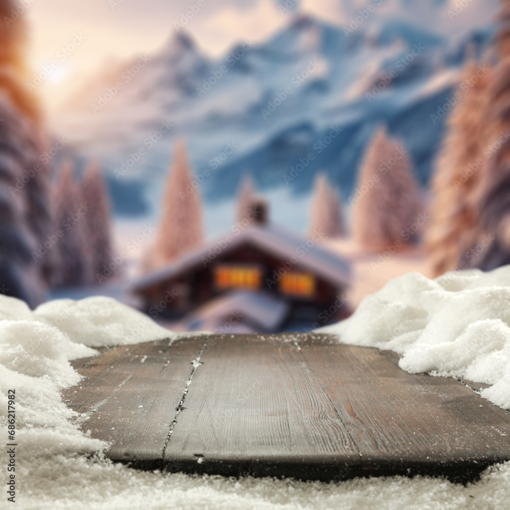 Wooden table cover of snow and frost. Empty space for your decoration. Christmas magic time and landscape of mountains. Natural light and rural view.