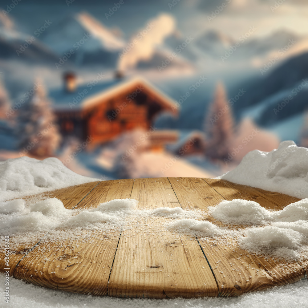Wooden table cover of snow and frost. Empty space for your decoration. Christmas magic time and landscape of mountains. Natural light and rural view.