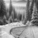 Wooden table cover of snow and frost. Empty space for your decoration. Christmas magic time and landscape of mountains. Natural light and rural view.