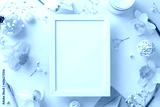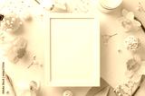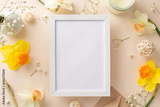 Embrace the beauty of spring holidays with daffodils and gypsophila. Above view photo features flower branches, envelope and candle on beige backdrop providing ample wooden frame for adverts or text