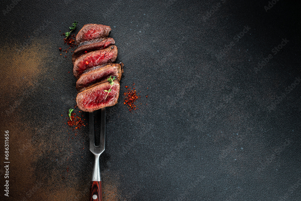 medium rare steak on an iron fork on a dark background. top view. copy space for text