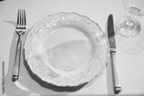 Top view. White plate in retro style with cutlery and glass.