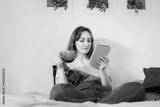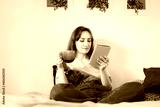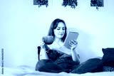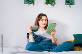 Young woman reading e-book on tablet reader in bed. Female relaxing with hot drink while reading an electronic book in cozy room. Mental health recovery, Personal growth. Hobby, Leisure time alone.