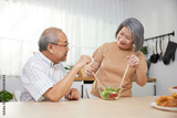 senior couple enjoy cooking and eating salad in the kitchen