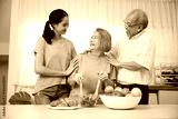 asian family senior couple and granddaughter enjoy cooking salad in the kitchen