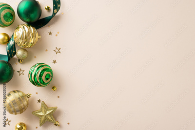 Infuse your promotions with Christmas magic using this top view photo featuring lavish baubles, gleaming star ornament, curly ribbon serpentine, jingle bells, gold confetti on joyful pastel background