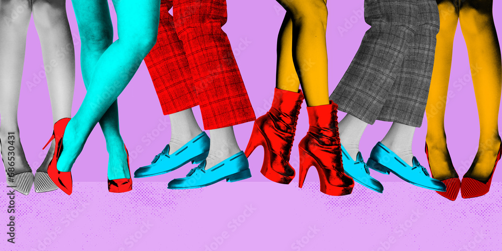 Poster. Contemporary art collage. Dancers legs dancing tap in club against retro colored background. Bright comics style design.