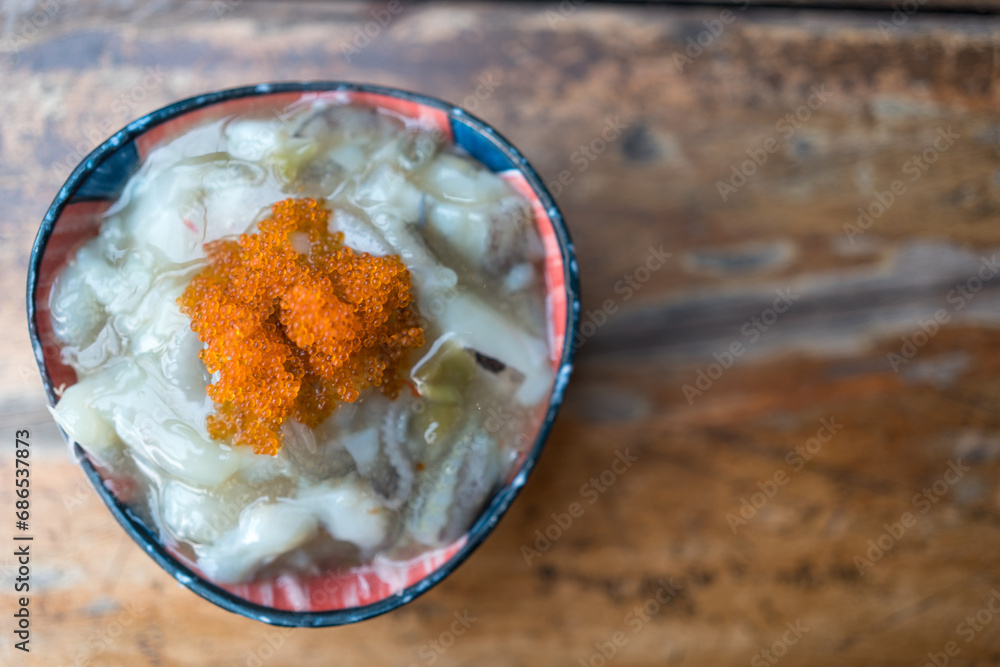Top view of Tako wasabi is Japanese food raw squid mixing with wasabi. Serve in mini bowl on wood background. Japanese side dish menu.