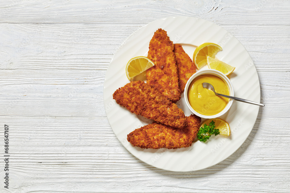 baked in oven breaded fish fillet served with yellow mustard and lemon slices on white plate on white wooden table, flat lay, free space