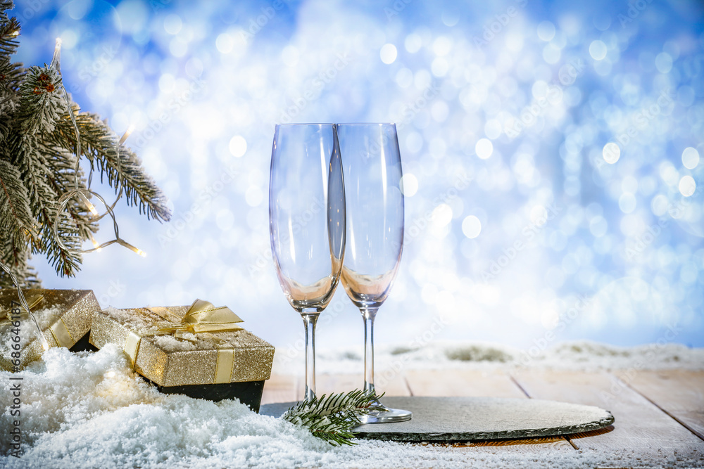 Two glasses of champagne and christmas gift. Black plate for your decoration and snow with forst. New year time background.