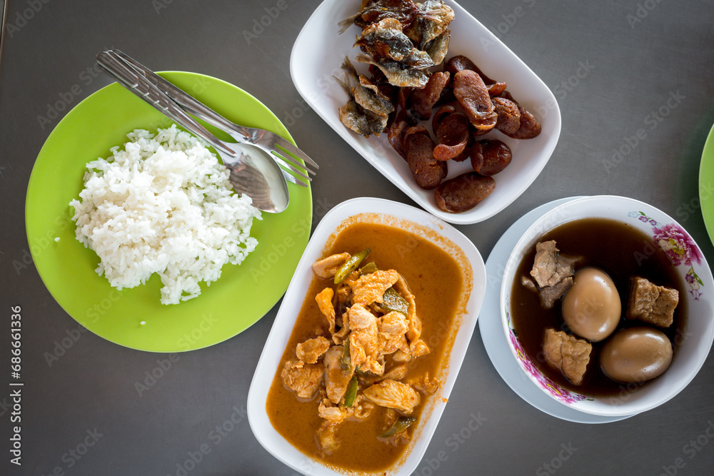 Various of Thai meals such as pork panang curry, stewed eggs eating with rice on wood table. Top view